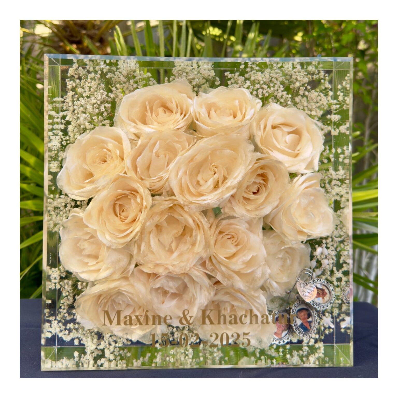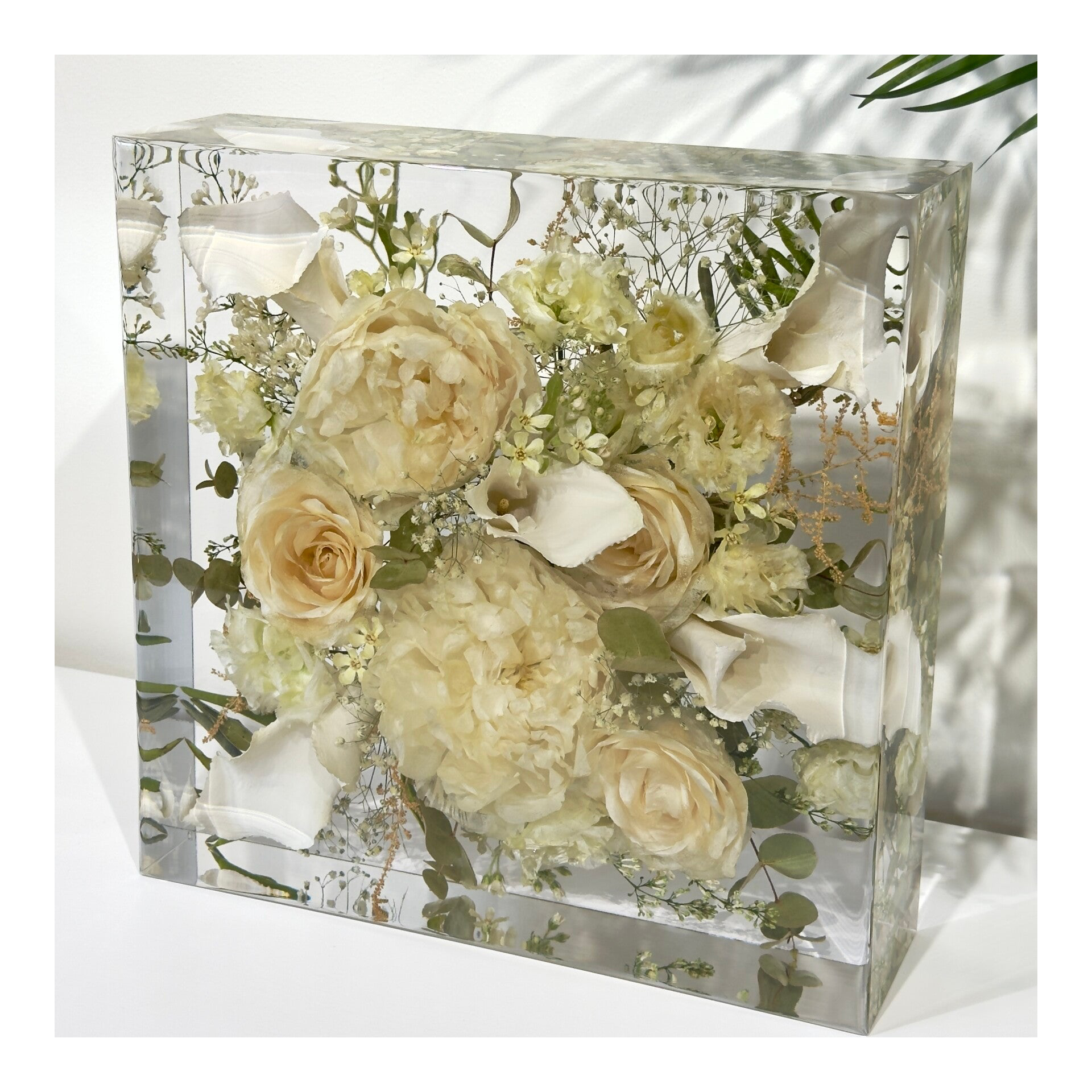 Het is mogelijk om onder andere crematie-as of een ander persoonlijk item bij de bloemen in de harsgieting te verwerken. Informeer bij ons naar de diverse opties.