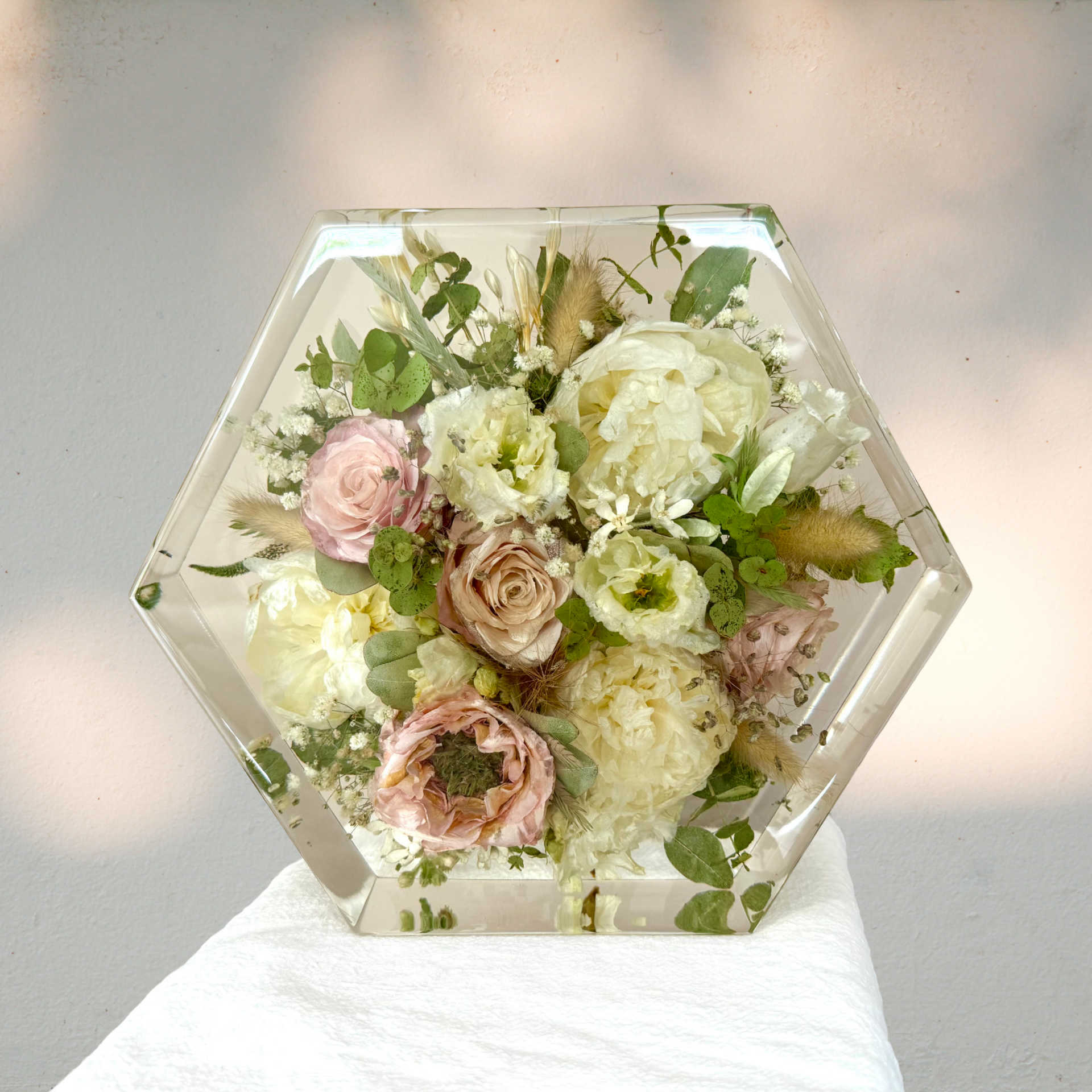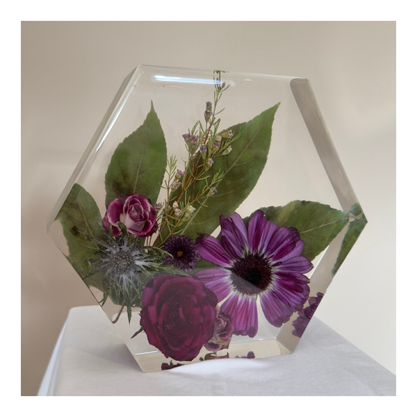 Helemaal “hip and happening”, de Hexagon van hars is een speelse vorm om jouw mooiste bloemen in te vereeuwigen.