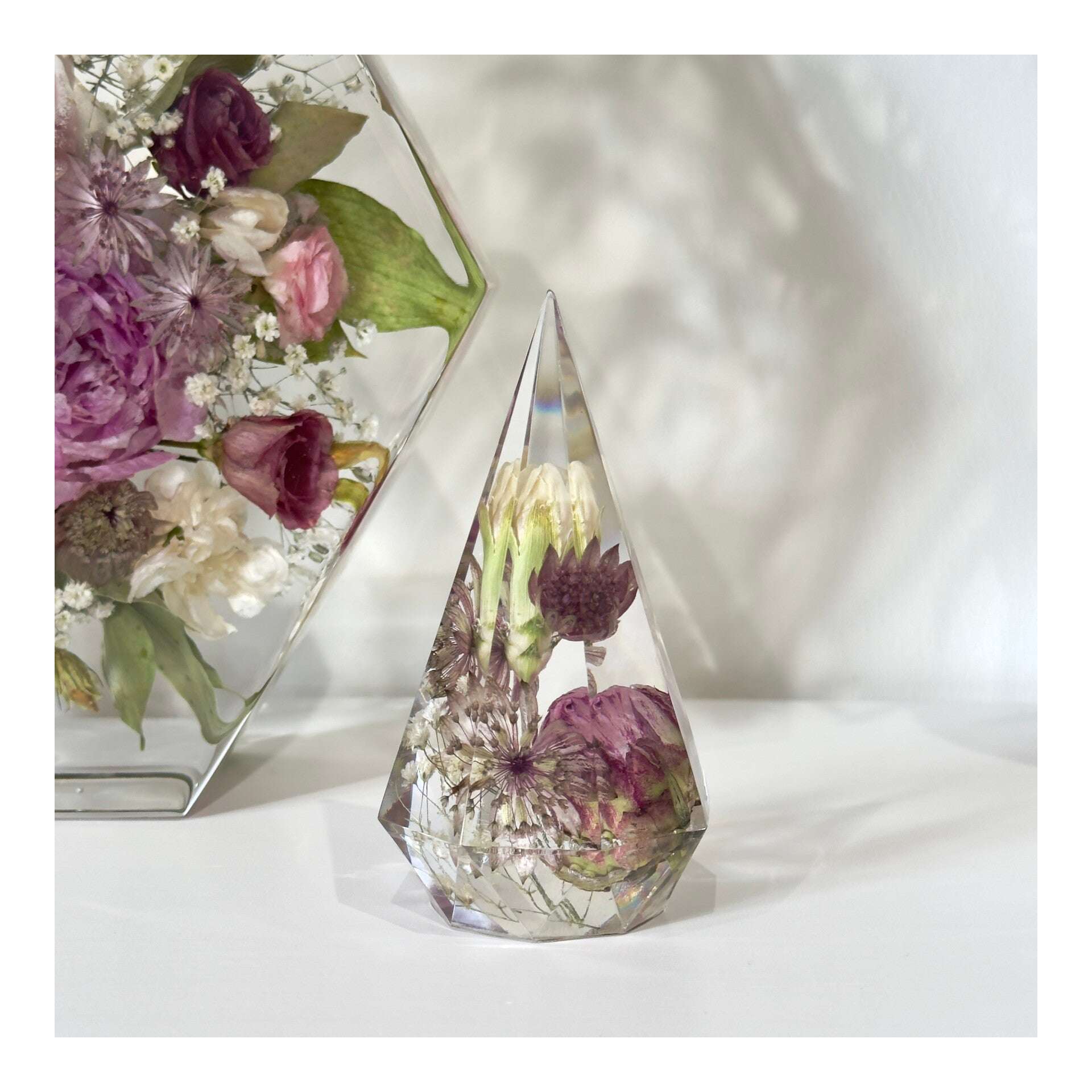 Het is mogelijk om onder andere crematie-as of een ander persoonlijk item bij de bloemen in de harsgieting te verwerken. Informeer bij ons naar de diverse opties.