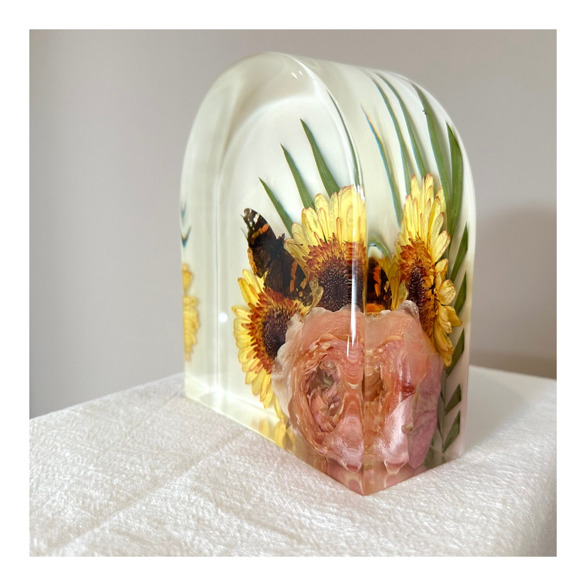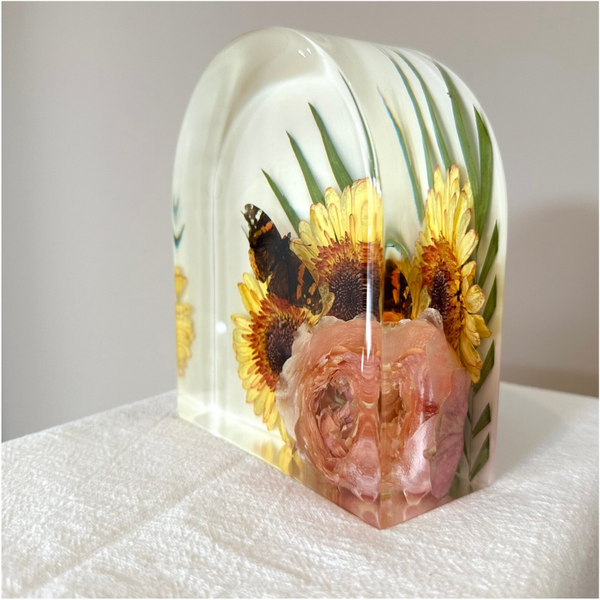 Het is mogelijk om onder andere crematie-as of een ander persoonlijk item bij de bloemen in de harsgieting te verwerken. Informeer bij ons naar de diverse opties.