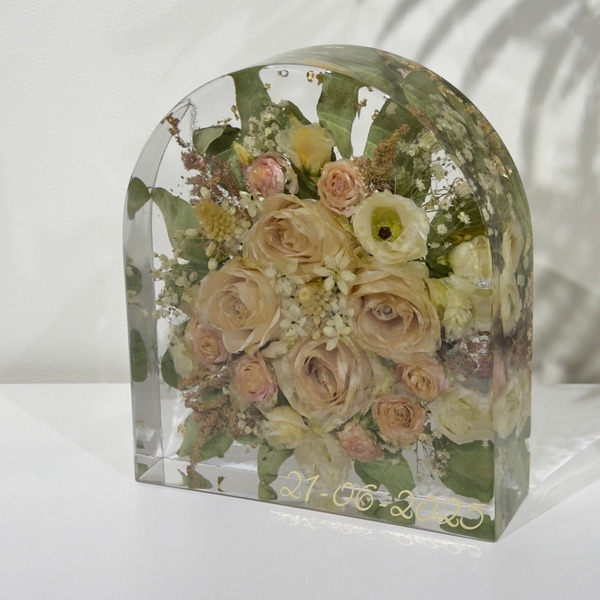Ben je op zoek naar een echte eyecatcher? Dan is de Large prachtig! Het is hierbij vaak mogelijk om (een groot deel van) een bruidsboeket in te gieten. Dankzij de extra hoogte van maximaal 7 cm is het mogelijk om ook hogere bloemen te vereeuwigen in hars.